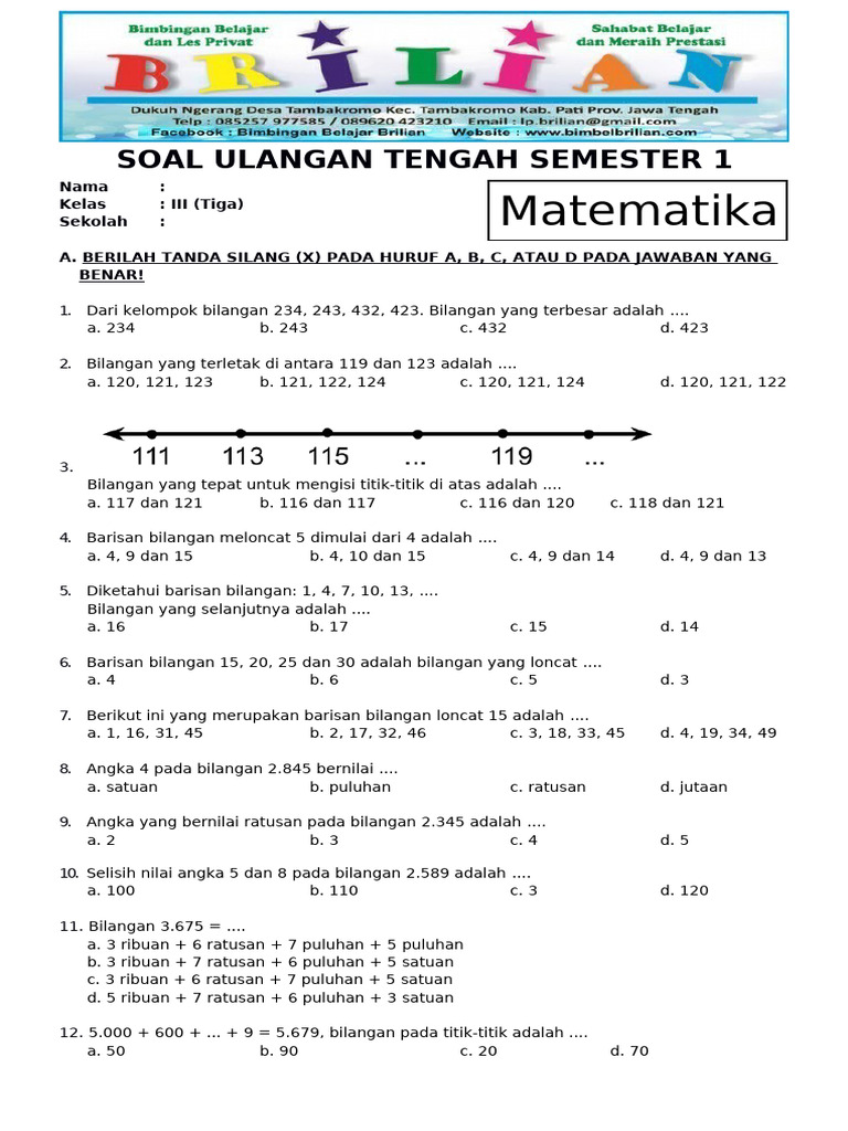 Ujian Tengah Semester (UTS) merupakan momen penting bagi siswa kelas 3 SD untuk mengukur pemahaman mereka terhadap materi yang telah dipelajari selama setengah semester. Mata pelajaran Matematika seringkali menjadi momok bagi sebagian siswa. Oleh karena itu, persiapan yang matang sangat diperlukan agar siswa dapat menghadapi UTS dengan percaya diri dan meraih hasil yang memuaskan.