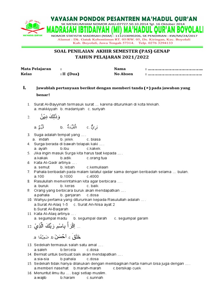 Artikel ini hadir sebagai panduan komprehensif bagi siswa Kelas 2 MTs, para guru, dan orang tua dalam mempersiapkan diri menghadapi evaluasi pembelajaran Quran Hadits semester 2. Kita akan mengupas tuntas berbagai jenis contoh soal yang relevan, mulai dari pemahaman bacaan, makna, hingga aplikasi nilai-nilai yang terkandung dalam ayat-ayat Al-Qur’an dan hadits-hadits pilihan. Dengan target sekitar 1.200 kata, kita akan menjelajahi berbagai aspek pembelajaran secara mendalam.
